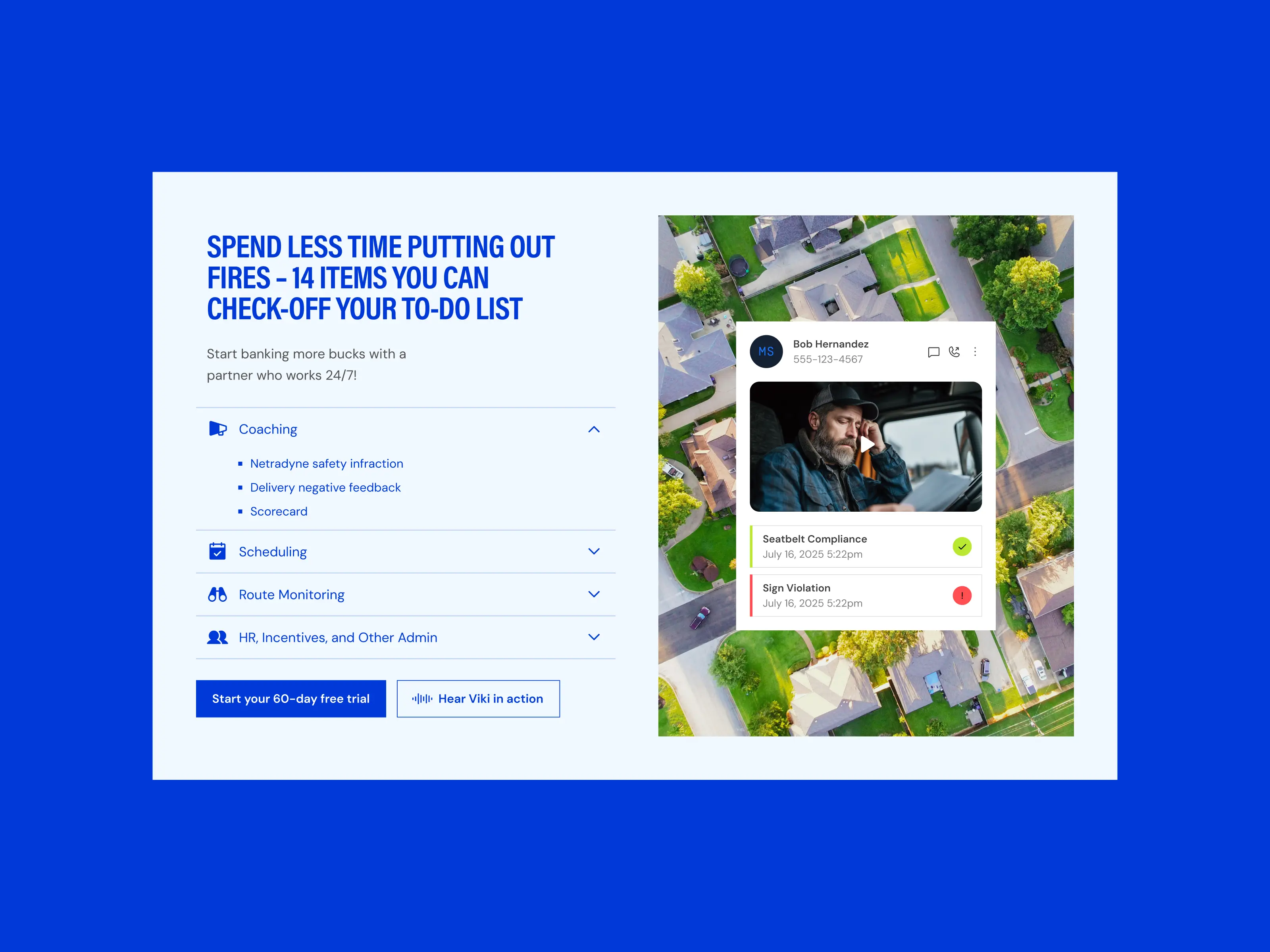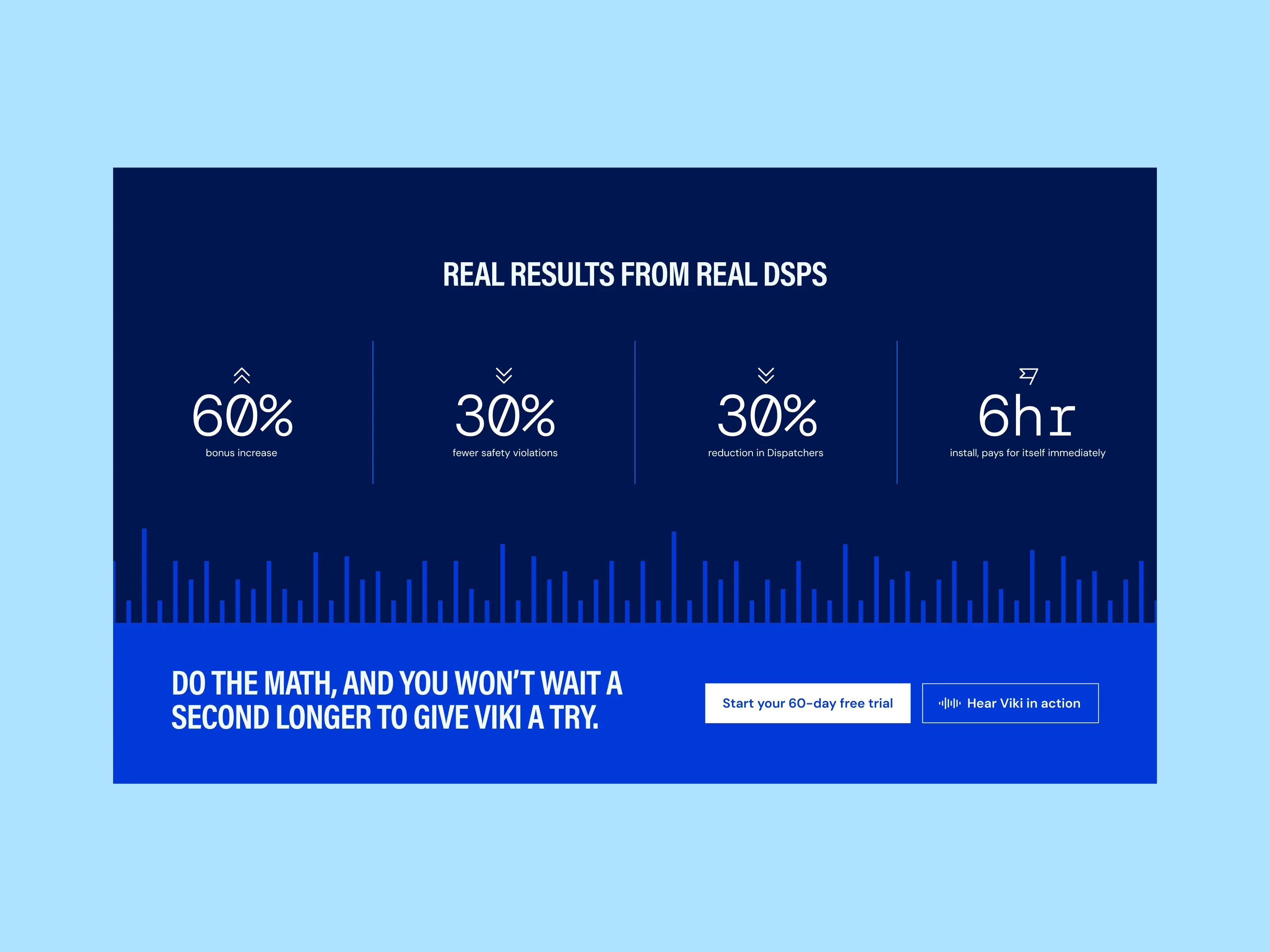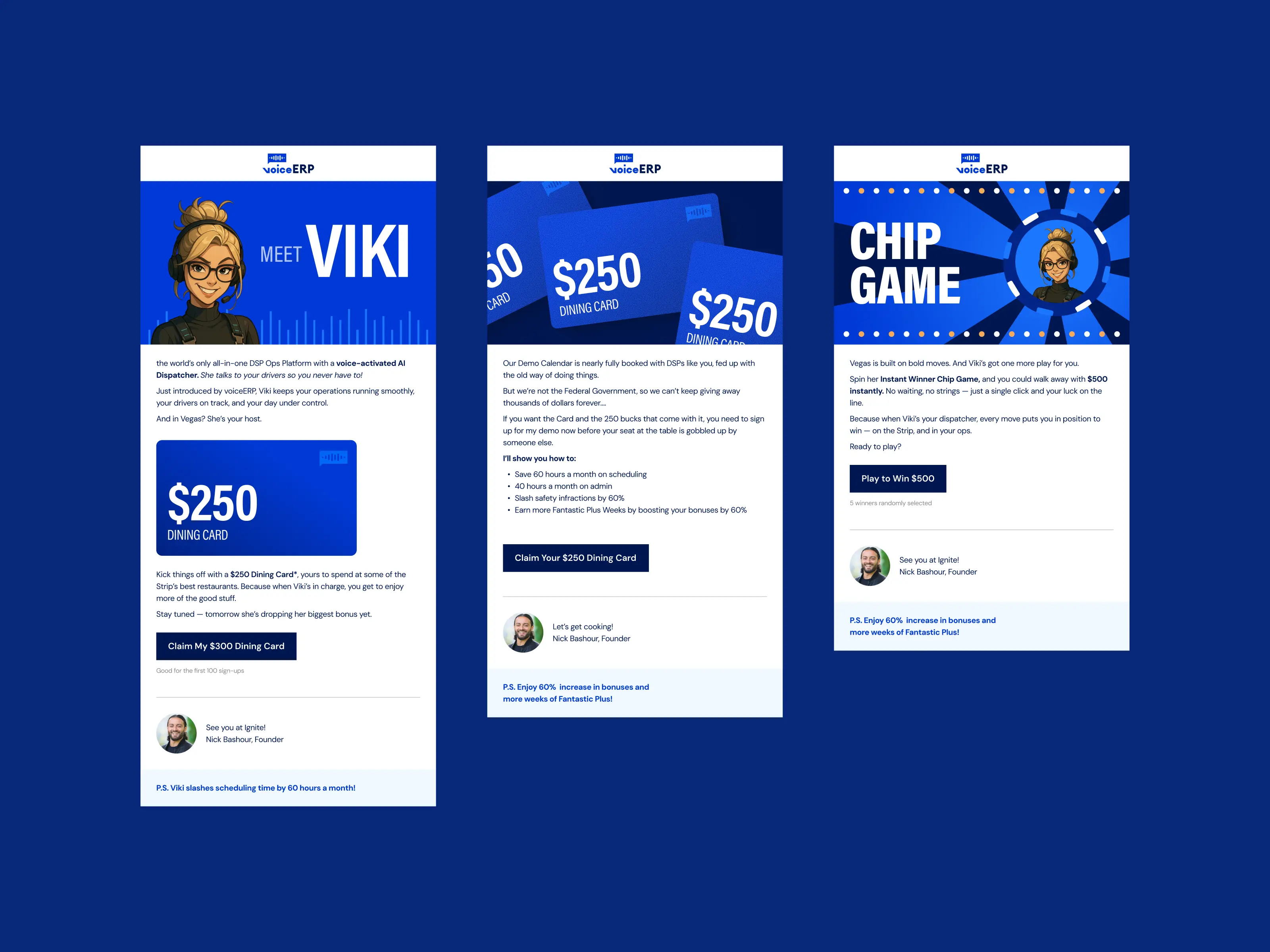 VoiceERP is an AI-powered operations platform built for delivery service providers, featuring Viki, a voice-activated dispatcher that automates scheduling, coaching, compliance, and HR. We partnered with the founders early on to craft a compelling pitch deck that helped them secure funding. Building on that momentum, we expanded the new brand across their website—highlighting the product’s features establishing credibility. Kem also created a show-stopping presence for their launch at the ignite exposition in Las Vegas.